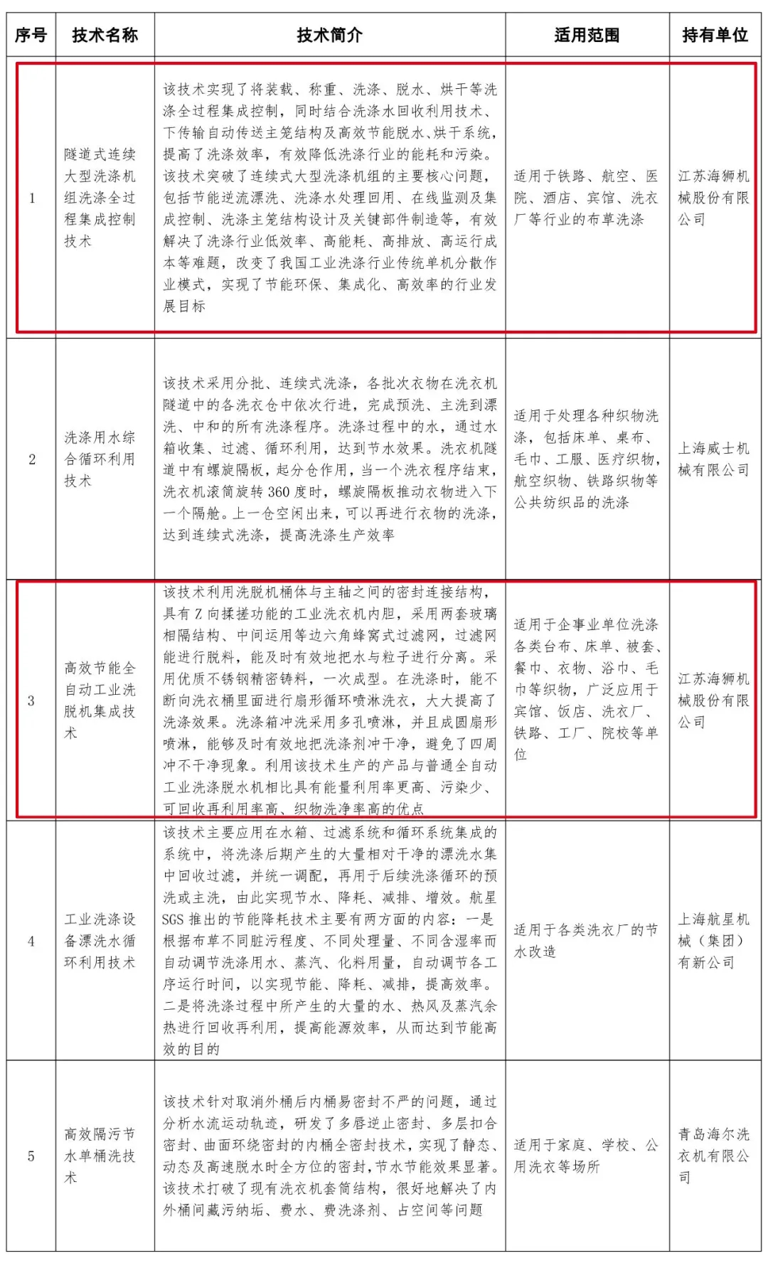 2020年11月16日,水利部、國(guó)家機(jī)關(guān)事務(wù)管理局關(guān)于公布國(guó)家成熟適用節(jié)水技術(shù)推廣目錄(2020年)的公告正式發(fā)布,為貫徹節(jié)水優(yōu)先方針,落實(shí)《國(guó)家節(jié)水行動(dòng)方案》目標(biāo)任務(wù),強(qiáng)化節(jié)水科技創(chuàng)新引領(lǐng),促進(jìn)水資源節(jié)約集約利用,水利部、國(guó)家機(jī)關(guān)事務(wù)管理局共同征集了洗滌設(shè)備、衛(wèi)生潔具、中央空調(diào)等領(lǐng)域的節(jié)水技術(shù)。經(jīng)專(zhuān)家評(píng)審、網(wǎng)絡(luò)公示,最后洗滌設(shè)備領(lǐng)域有4家企業(yè)5項(xiàng)成熟技術(shù)被收錄到《國(guó)家成熟適用節(jié)水技術(shù)推廣目錄(2020年)》中。江蘇海獅機(jī)械股份有限公司的隧道式連續(xù)大型洗滌機(jī)組洗滌全過(guò)程集成控制技術(shù)和高效節(jié)能全自動(dòng)工業(yè)洗脫機(jī)集成技術(shù)被收錄到國(guó)家成熟適用節(jié)水技術(shù)推廣目錄之中。