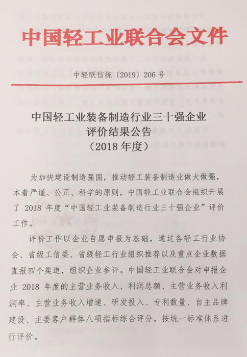 為加快建設(shè)強(qiáng)國,推動(dòng)輕工裝備制造業(yè)做大做強(qiáng),本著嚴(yán)謹(jǐn)、公正、科學(xué)的原則,中國輕工業(yè)聯(lián)合會(huì)組織開展了2018年度“中國輕工業(yè)裝備制造行業(yè)三十強(qiáng)企業(yè)”、“中國輕工業(yè)科技百強(qiáng)企業(yè)”評(píng)價(jià)工作。