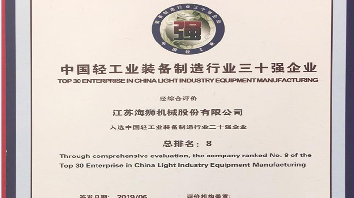 今日江蘇海獅機械股份有限公司榮獲了中國洗滌機械行業(yè)十強首位,中國輕工業(yè)裝備制造行業(yè)三十強企業(yè)第8位,中國輕工業(yè)科技百強企業(yè)第23位為加快建設強國,推動輕工裝備制造業(yè)做大做強,本著嚴謹、公正、科學的原則,中國輕工業(yè)聯(lián)合會組織開展了2018年度“中國輕工業(yè)裝備制造行業(yè)三十強企業(yè)”、“中國輕工業(yè)科技百強企業(yè)”評價